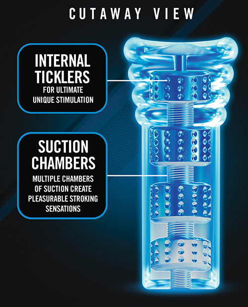 The M for Men All Nighter is loaded with fun! This stroker is self-lubricating. Add a little water or saliva, and everything gets slippery. It also glows blue in the dark making it easy to see at night. The All Nighter has a soft erotic feel for sensational stroking and a ribbed inside for pressure point massage and pleasure. Super-soft and flexible, the All Nighter will fit any size shaft. Made of TPE: it is free of phthalates, fragrances, paraffins and latex. Self lubricating feature lasts up to 12 uses. After that you can add water based, hybrid or silicone lubricant