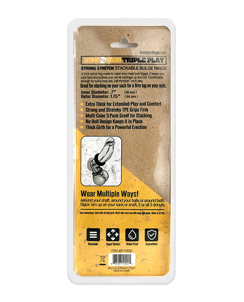 Extra thick and comfortable the Triple Play Cock Ring contains the 3 perfect size donut rings. Each kit contains a black, clear, and smoke colored ring, intended to be worn around cock, balls or both. They are made of super strong and stretchy TPE and are phthalate free. The Triple Play Cock Ring are soft, stretchy, easy to get on, and help you keep a firm and hard erection.