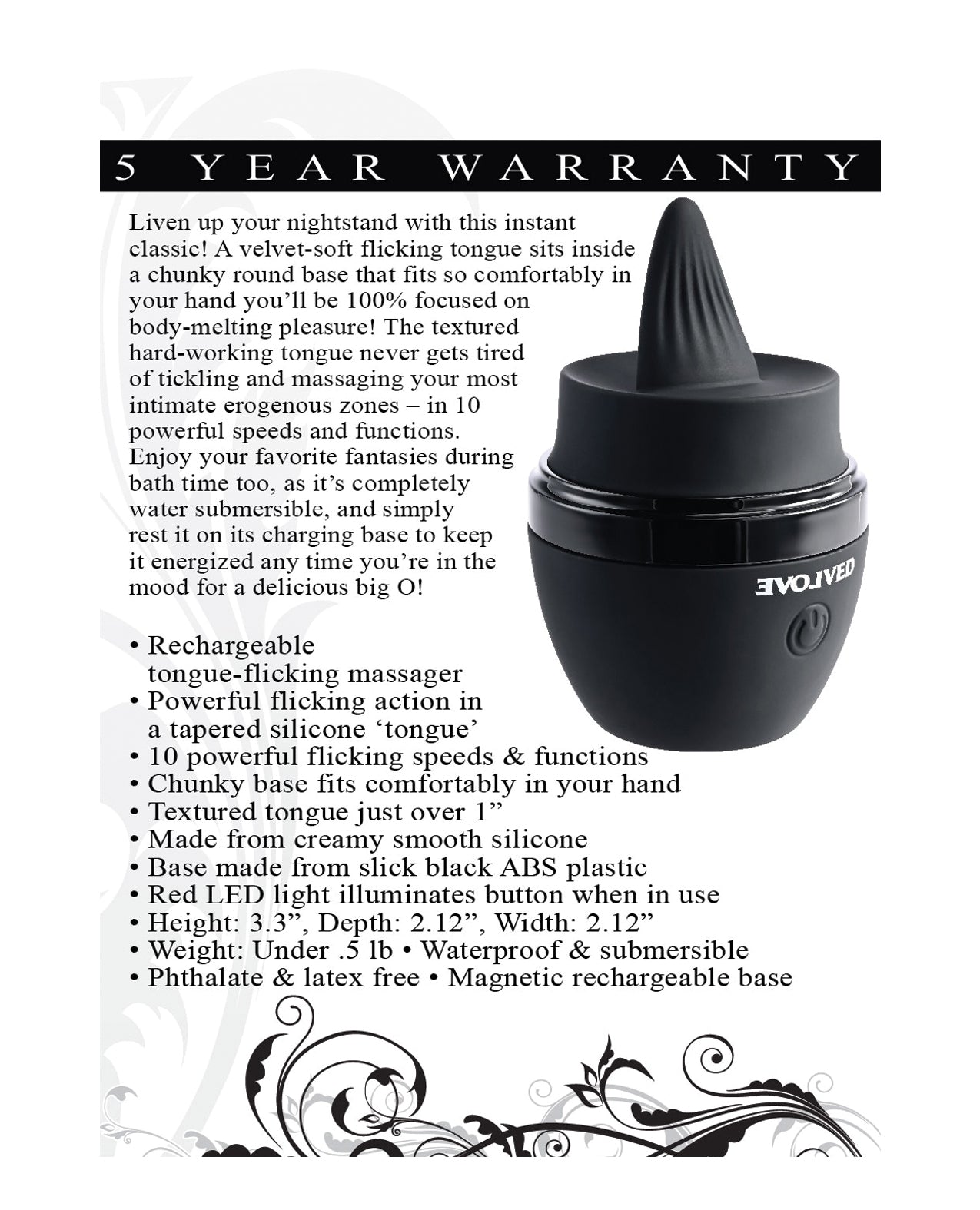 Liven up your nightstand with this instant classic! A velvet-soft flicking tongue sits inside a chunky round base that fits so comfortably in your hand you'll be 100% focused on body-melting pleasure! The textured hard-working tongue never gets tired of tickling and massaging your most intimate erogenous zones - in 10 powerful speeds and functions. Enjoy your favorite fantasies during bath time too, as it's completely water submersible, and simply rest it on its charging base to keep it energized any time you're in the mood for a delicious big O!