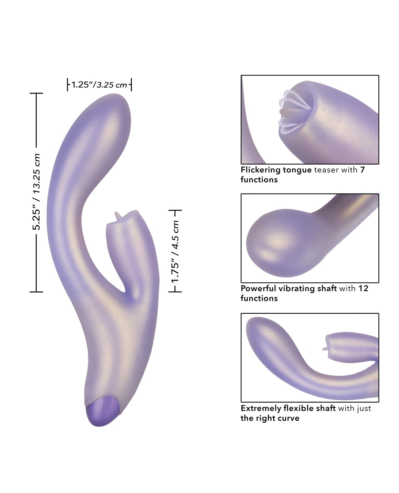 The gorgeous G-Love G-Kiss is a dual stimulating massager with vibrating shaft and flickering tongue-like teaser. Love yourself just right with the flexible G shaft, 7 independent functions of flickering action and 12 independent functions of vibrations. The flickering teaser tip and sensually curved shaft are perfect for teasing internal and external sweet spots. For an ultra smooth surface and flexible body, the curved stimulator and massager are covered in a shimmering Silicone