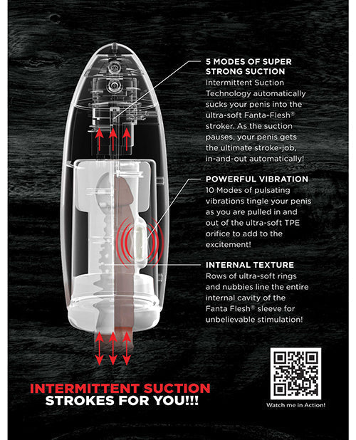 5 modes of SUPER STRONG SUCTION. Intermittent Suction Technology automatically sucks your penis into the ultra-soft Fanta-Flesh® stroker. As the suction pauses, your penis gets the ultimate stroke-job, in-and-out automatically!