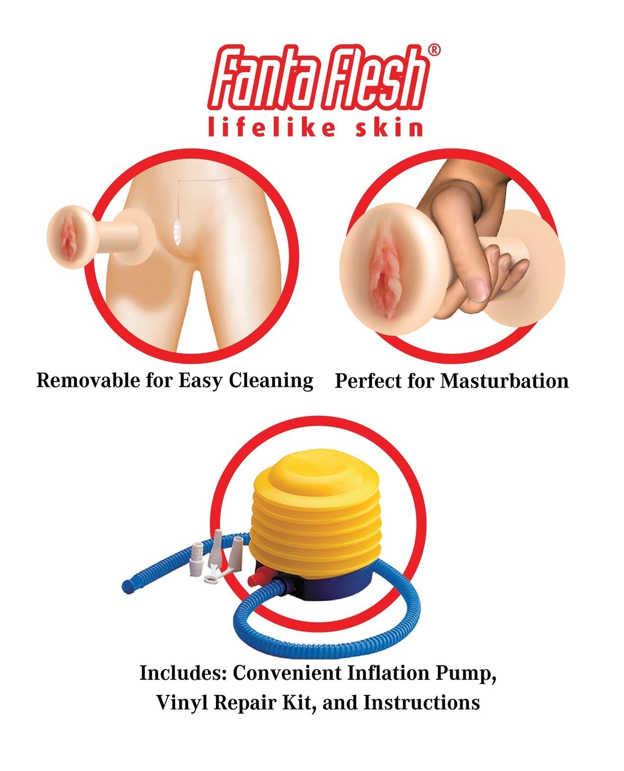 Give her firm and perky breasts a squeeze while you enjoy her ultra-lifelike Fanta-Flesh skin, pussy, and ass that feels even better than the real thing! The Fanta-Flesh pussy and ass are removable for easy in-depth cleaning, and can even be enjoyed separately for masturbation. An inflation pump, vinyl repair kit, and instructions are conveniently included.