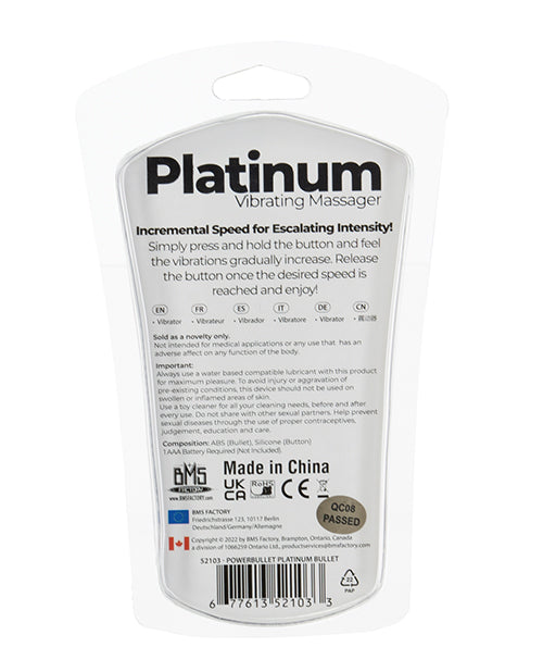 In a beautiful platinum finish, this 3.7” bullet vibrator provides incremental speed of targeted vibrations to its user. Powered by 1 AAA battery (sold separately), simply press and hold the button at the bottom of the base and experience the gradual increase of this incredible toy. When you've reached your desired speed, release the button and enjoy the vibrations.