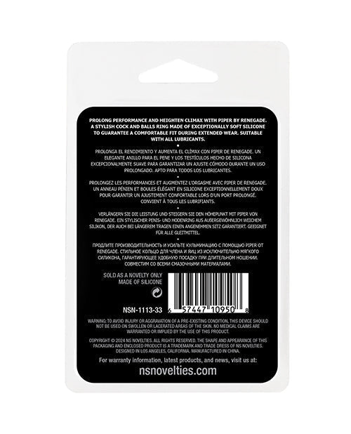 Prolong performance and heighten climax with Piper by Renegade. A stylish cock and balls ring made of exceptionally soft silicone to guarantee a comfortable fit during extended wear. Suitable with all lubricants.