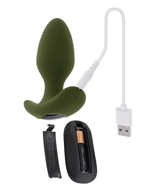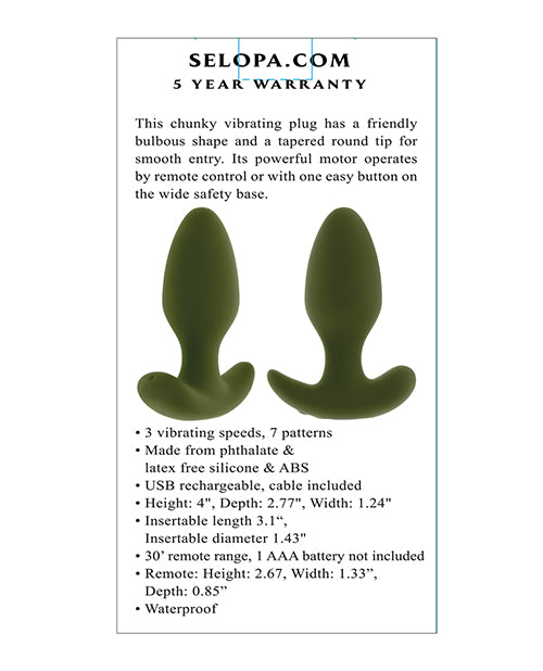 This chunky vibrating plug has a friendly bulbous shape and a tapered round tip for smooth entry. Its powerful motor operates by remote control or with one easy button on the wide safety base.
