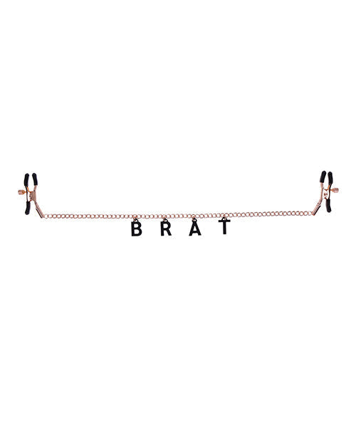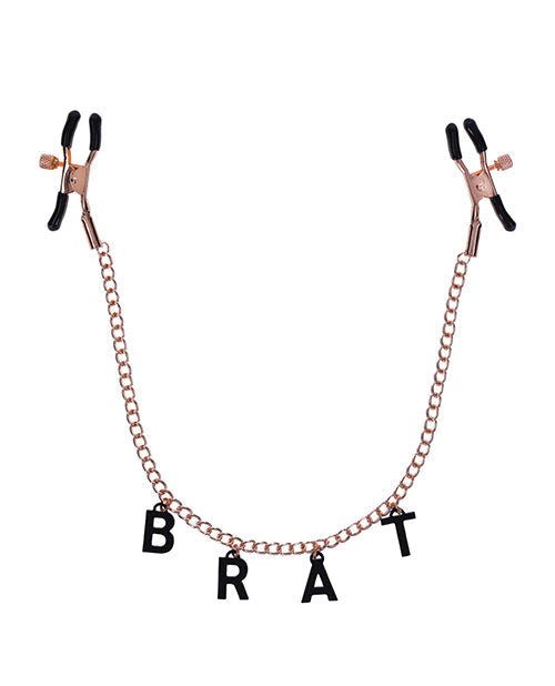 Embrace your brattiest attributes and proudly display your naughtiness with the Brat Charmed Nipple Clamps! Adjust the tension and explore pleasure at every intensity with the rubber tipped, rose gold chained nipple clamps. Own every teasing quality you love with the black charms stretched across the chain labelling you for what you love to be, a "BRAT"!