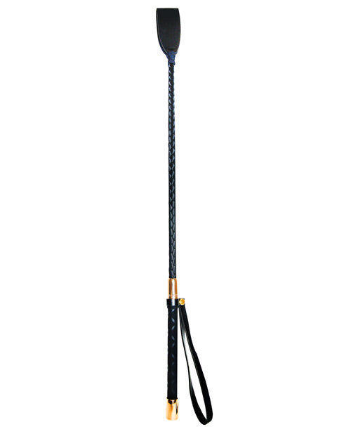 A vegan leather looped head creates a pleasing crack with every smack. The tightly webbed, hand-wrapped shaft is springy and strong and leads the eye to the sturdy and elegant handle. A wrist loop makes it easy to stow at a moments notice, in case the action intensifies. The rose gold caps that adorn the handle add another luxurious dimension to this solid, sleek, and striking implement of impact.