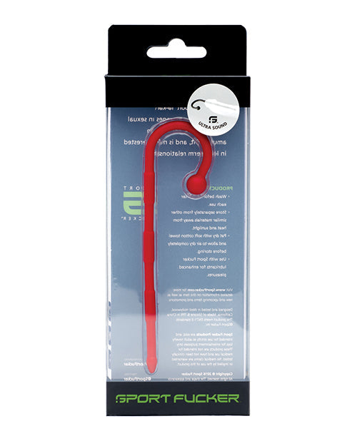 Looking to try to bust your final sex-cherry? Sounding is quickly becoming one of the fastest growing fetishes among men. You already spend half of your free time rubbin' and tuggin' on your best appendage. Why not stimulate it from the inside? Not into traditional medical play? No problem. With our 100% medical grade premium silicone sounds, your best man and its urethra will thank you! All the metal benefits of an ultra-smooth surface and ability to sterilize without the cold, non-bending attributes of a traditional metal sound. This great plug has three cylindrical ridges slightly raised wider than the shaft. What makes this plug unique is the curved handle that goes over the head of your cock and rests with its ball right on your frenulum glan. This is a great sensation of both internal and a slight external stimulation. Plus, it looks hot to see the handle sticking out, knowing your throbbing member is stuffed with the Ultra Sound. Be sure to only use these great toys with sterile lube. Material: Silicone Dimensions: Length: 12.7cm. (5 in.) Ball: 1cm. (4 in.) Shaft: 4.35mm.-4.6mm. (.17-.18 in.) Ridges: 5.1mm-5.2mm (.2-.21 in) Tip: 5.2mm. (.21 in) Distance from ball to shaft: 2.3 cm. (.9 in)