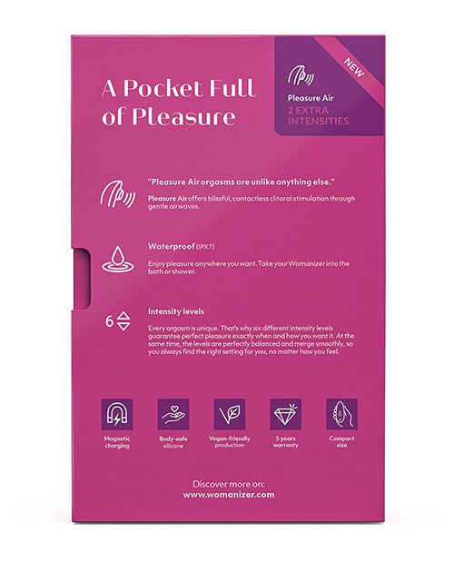 Compact sized clitoral stimulator for people seeking the unique sensations of Pleasure Air Technology. The new Womanizer STARLET 3 - it's the original Womanizer Pleasure Air Technology combined with five new vivid product colors and two more intensity levels, while it's still waterproof and USB rechargeable - for a reasonable price. 6 intensity levels - Every orgasm is unique. That's why six different intensity levels guarantee perfect pleasure exactly when and how you want it. The intensity levels are perfectly balanced and offer the right setting for your every mood. Body fit - The sensual, slim design fits comfortably in your hand and becomes the perfect companion for even the most intimate moments.?IPX7 Waterproof - You want to dive deeper? Since your WOMANIZER is IPX7 waterproof, nothing stands in the way of a long, relaxing bath, a refreshing shower or even a pool party. Materials : ABS plastic made without phthalates, BPA or latex. Dimensions : 117mm x 46mm x 47mm USB rechargeable - Run Time : 30 min Charge Time : 30 min Five Year Warranty.